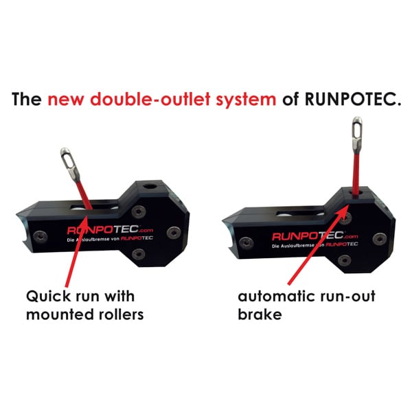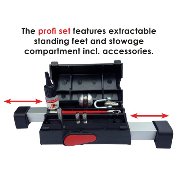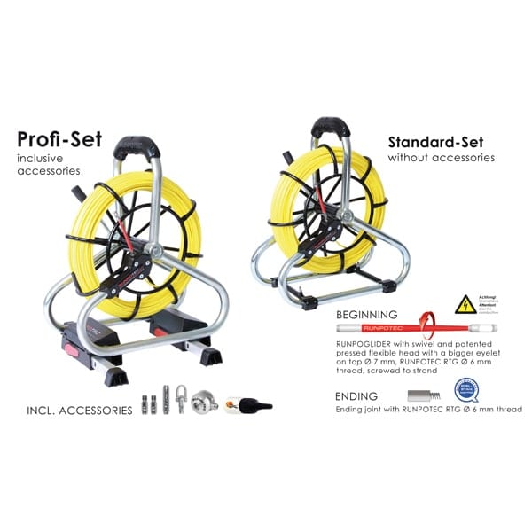Set Profi tijă din fibră de sticlă Ø 4,5 mm – RUNPOTEC RTG Ø 6 mm filet cu cușcă robustă din oțel (zincat/ vopsit cu pulbere) cu nou, sistem cu dublă evacuare (frână automată și evacuare rapidă), frână suplimentară de blocare, picioare extractibile în picioare și compartiment de depozitare pentru accesorii.